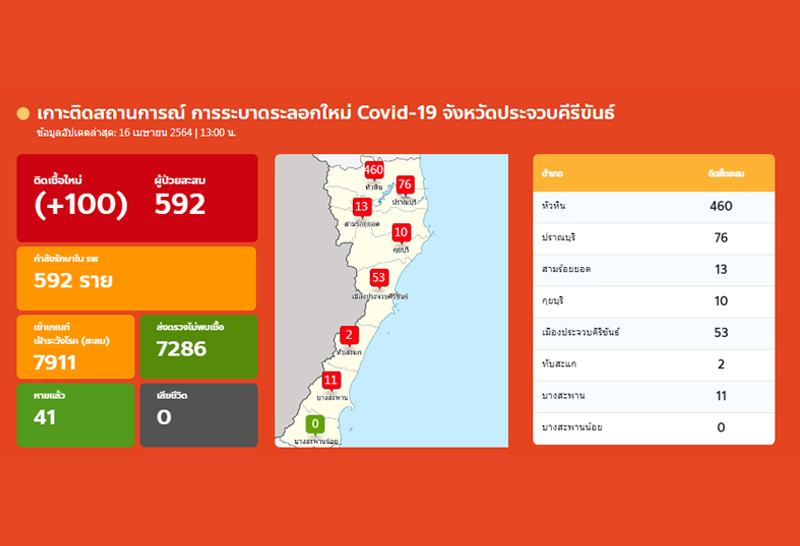 ประจวบคีรีขันธ์ พบโควิดอีก 100 ราย ผู้ป่วยสะสม 592 ราย อ.หัวหินมากสุด 460 ราย