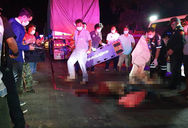 เกิดอุบัติเหตุซ้ำซ้อนกระบะชน จยย.ล้มกลางถนน รถพ่วงเหยียบซ้ำตายคาที่