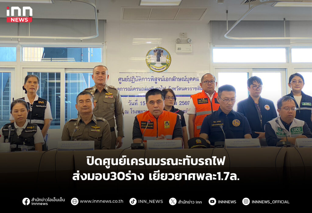 ผู้ว่าฯ นครราชสีมา แถลงปิดศูนย์พิสูจน์เอกลักษณ์บุคคล เครนร่วงทับรถไฟสีคิ้วเสียชีวิต 30 ราย ส่งมอบร่างให้ญาติทั้งหมดภายในวันนี้ เยียวยารายละกว่า 1.7 ล้านบาท