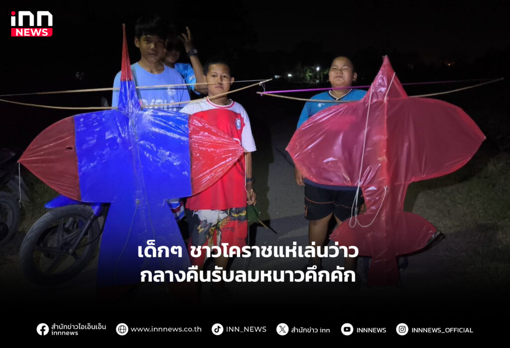 เด็กๆ ชาวโคราช แห่เล่นว่าวกลางคืนรับลมหนาวคึกคัก บอกมีลมแรงเหมาะแก่การวิ่งว่าวเป็นอย่างมาก