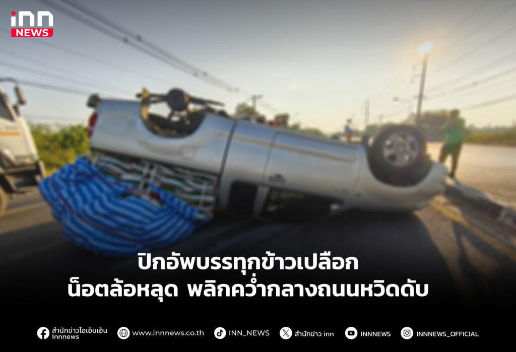 ปิกอัพบรรทุกข้าวเปลือกน็อตล้อหลุด พลิกคว่ำกลางถนนหวิดดับ
