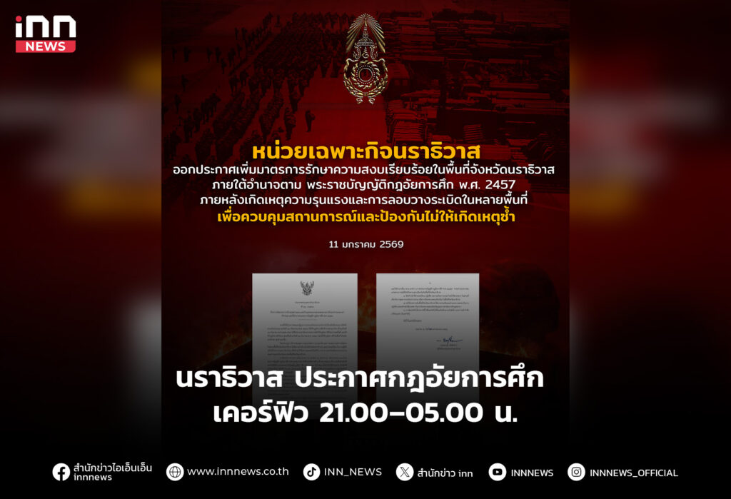 ยกระดับความปลอดภัยนราธิวาส ประกาศกฎอัยการศึก เข้มชายแดนไทย–มาเลเซีย เคอร์ฟิว 21.00–05.00 น.