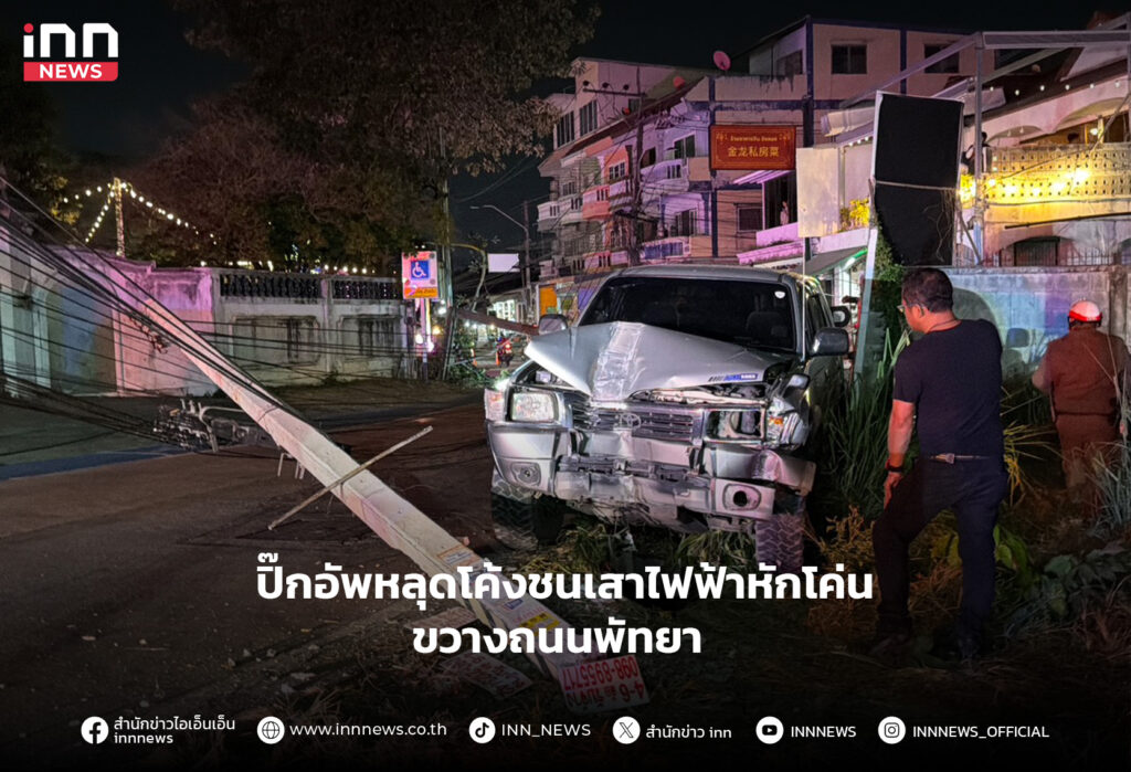 ปิ๊กอัพหลุดโค้งชนเสาไฟฟ้า หักโค่นขวางถนนพัทยา