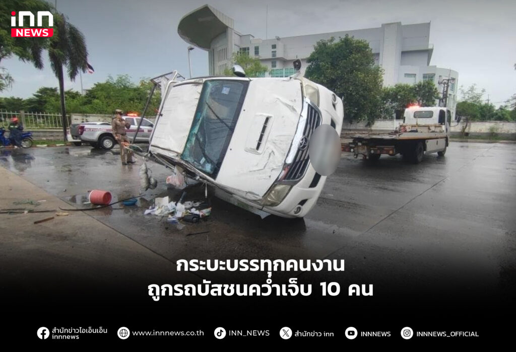 กระบะบรรทุกคนงานถูกรถบัสชนคว่ำเจ็บ 10 คน