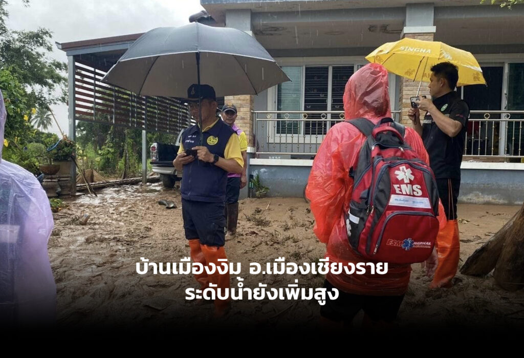บ้านเมืองงิม อ.เมืองเชียงราย ระดับน้ำเพิ่มสูง ขณะจังหวัดส่งอาหารให้แก่หมู่บ้านที่ประสบภัยในพื้นที่ ต.เทอดไทย อ.แม่ฟ้าหลวง ที่ถูกดินถล่ม