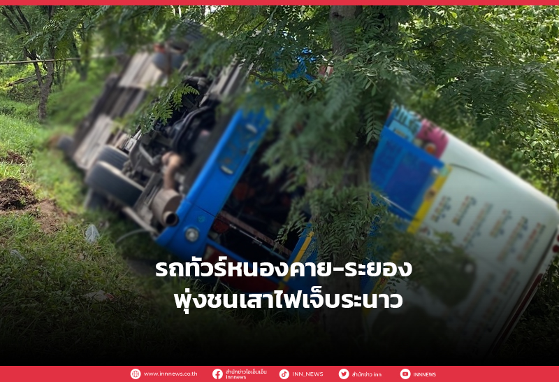 รถทัวร์หนองคาย-ระยอง พุ่งชนเสาไฟเจ็บระนาว