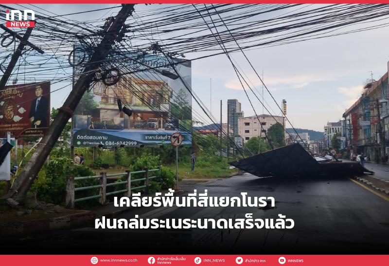 เจ้าหน้าที่เคลียร์พื้นที่บริเวณสี่แยกโนราเสร็จแล้ว และเปิดกระแสไฟฟ้าและเปิดถนนให้กลับมาสัญจรได้ตามปกติ หลังจากที่ถูกลมฝนกระหน่ำ