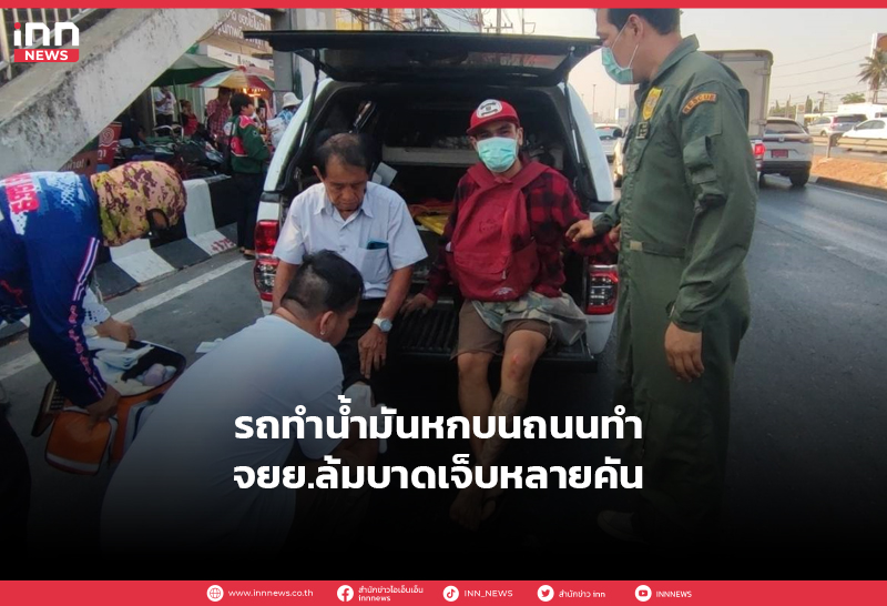 รถทำน้ำมันหกบนถนนทำจยย.ล้มบาดเจ็บหลายคัน
