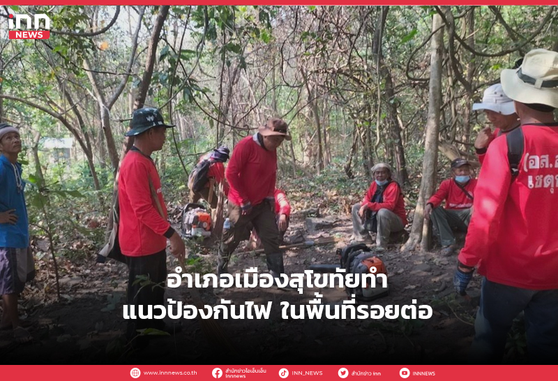 อำเภอเมืองสุโขทัยทำแนวป้องกันไฟ ในพื้นที่รอยต่อ พร้อมงดเผาใบไม้ในป่าเพื่อหาของป่า