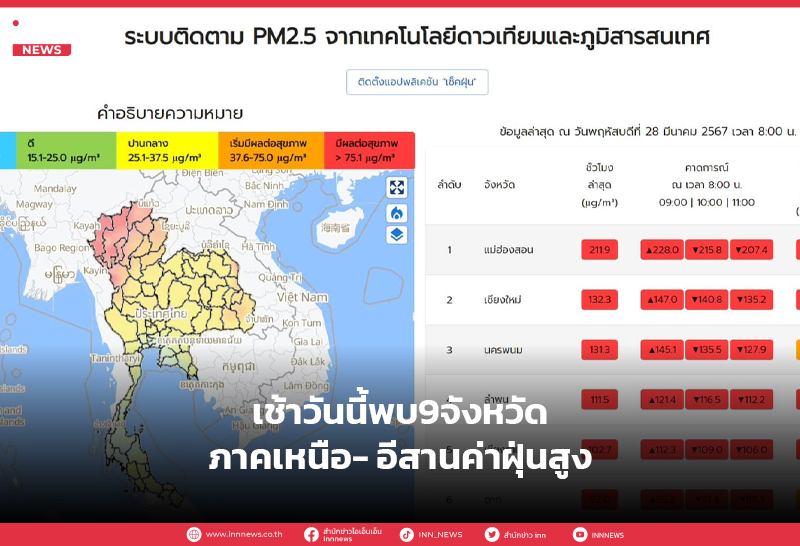 เช้าวันนี้พบ 9 จังหวัด ภาคเหนือ- อีสาน ค่าฝุ่นสูงมีผลกระทบต่อสุขภาพ แม่ฮ่องสอนฝุ่นทะลุกว่า 200 ไมโครกรัม