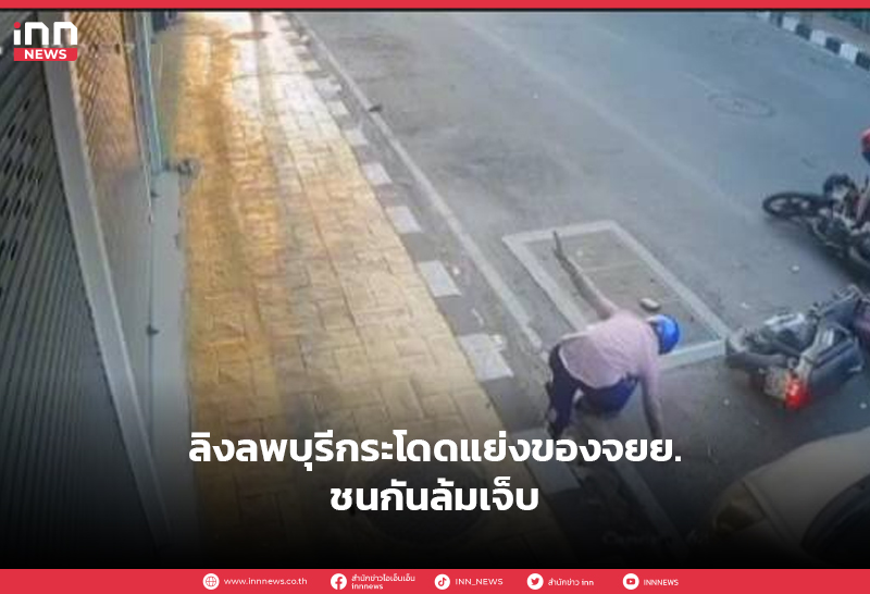 กล้องวงจรปิดจับได้อีกแล้วเจ้าจ๋อกระโดดแย่งของ ขณะขับรถจยย.เสียหลักชนกันบาดเจ็บ
