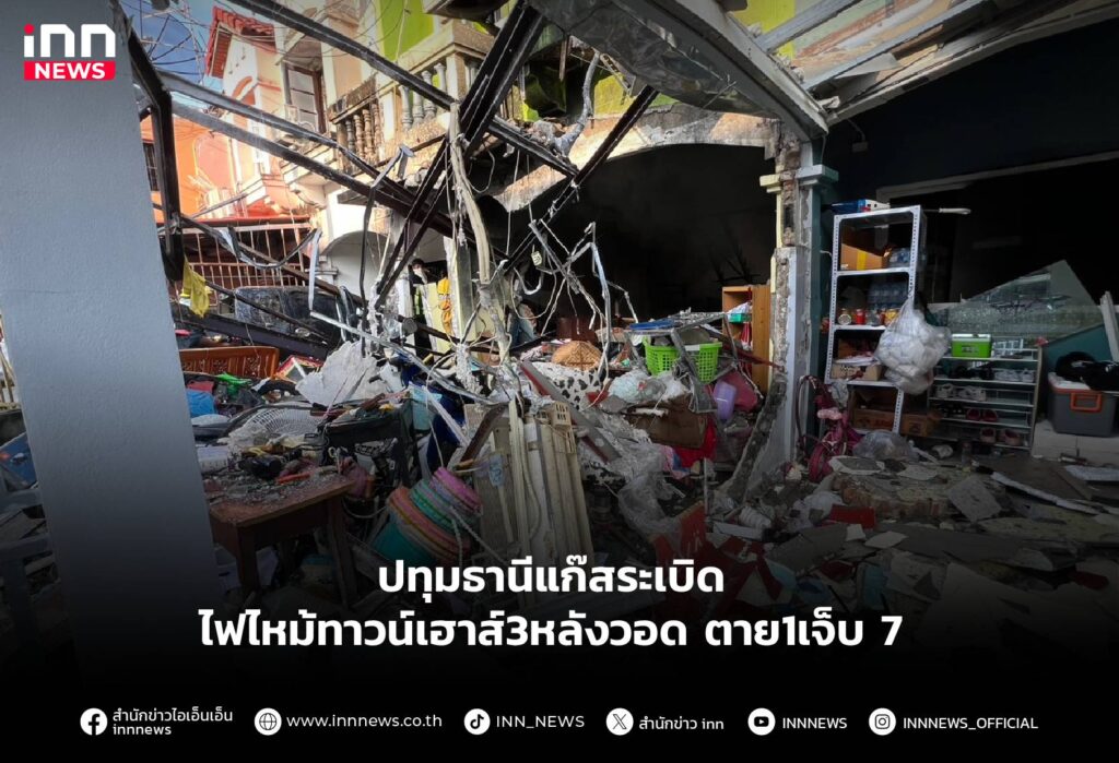 แก๊สระเบิด ไฟไหม้ทาวน์เฮาส์3หลังวอด ตาย1เจ็บ 7 ตรงข้าม อบจ.ปทุมธานี บ้านทรุดตัวพังหลายหลัง จนท.เร่งสอบสาเหตุ