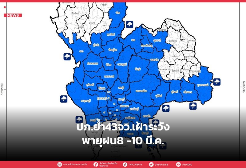 ปภ. เน้นย้ำ43 จังหวัด เหนือ อีสาน กลาง และกทม. เฝ้าระวังสถานการณ์พายุฝนฟ้าคะนองและลมกระโชกแรง 8 -10 มี.ค.