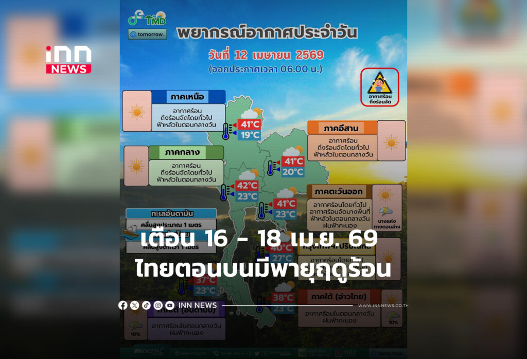 กรมอุตุฯ เตือน 16 - 18 เม.ย. 69 ประเทศไทยตอนบนมีพายุฤดูร้อน ฝนฟ้าคะนอง ลมกระโชกแรง ลูกเห็บตกบางแห่ง และอาจมีฟ้าผ่า