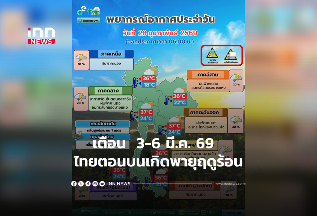 เตือน 3-6 มี.ค. 69 ไทยตอนบนเกิดพายุฤดูร้อน