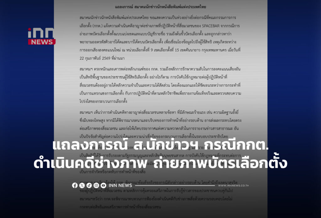สมาคมนักข่าวนักหนังสือพิมพ์แห่งประเทศไทย แถลงการณ์ เป็นห่วง กรณี กกต.ดำเนินคดีต่อช่างภาพ ถ่ายภาพบัตรเลือกตั้ง เรียกร้องพิจารณาข้อเท็จจริง