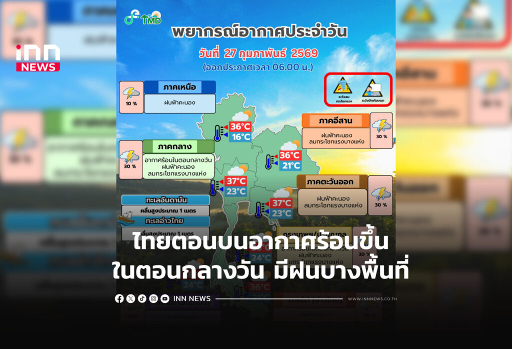 ประเทศไทยตอนบนอากาศร้อนขึ้นในตอนกลางวัน มีฝนฟ้าคะนองและลมกระโชกแรงบางพื้นที่ กรุงเทพ ปริมณฑลฝนร้อยละ 30