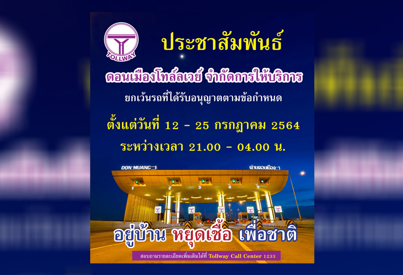ดอนเมืองโทล์เวย์จำกัดการให้บริการ12-25ก.ค.ระหว่างเวลา21.00-04.00น.