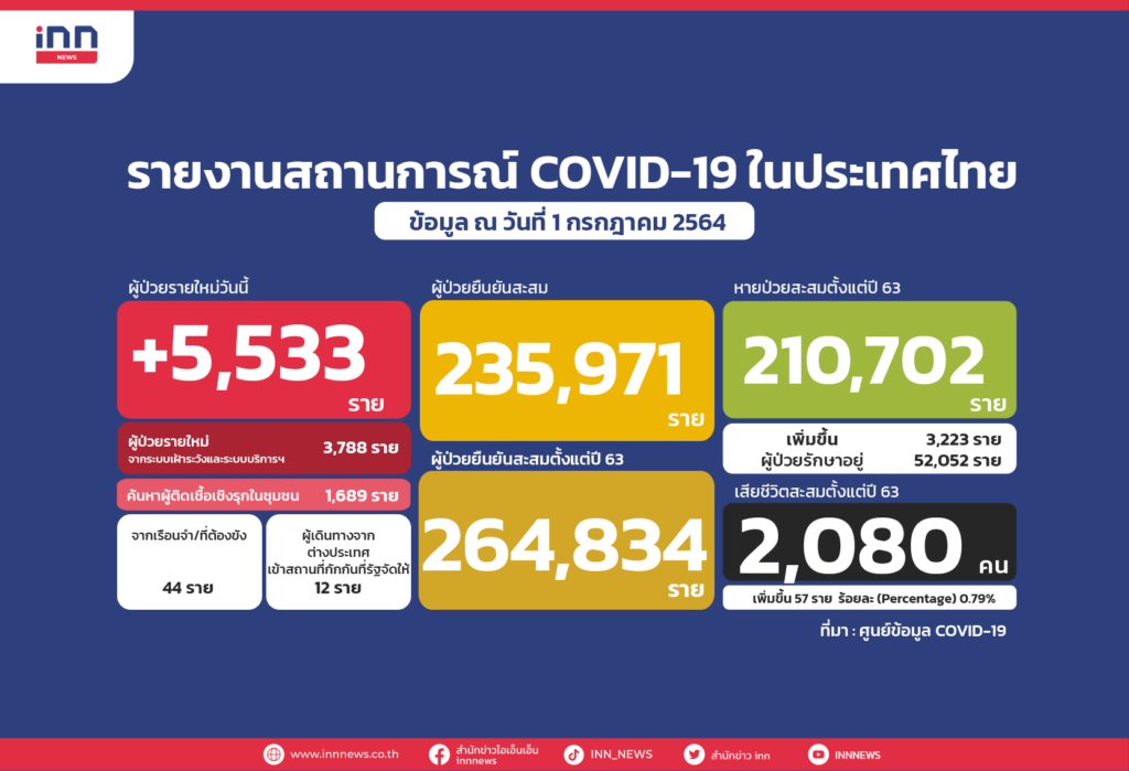 พุ่งต่อเนื่อง! ไทยติดเชื้อรายใหม่ 5,533 ราย ตายเพิ่มทะลุ 57 ราย ขณะรักษาหายแล้ว 3,223