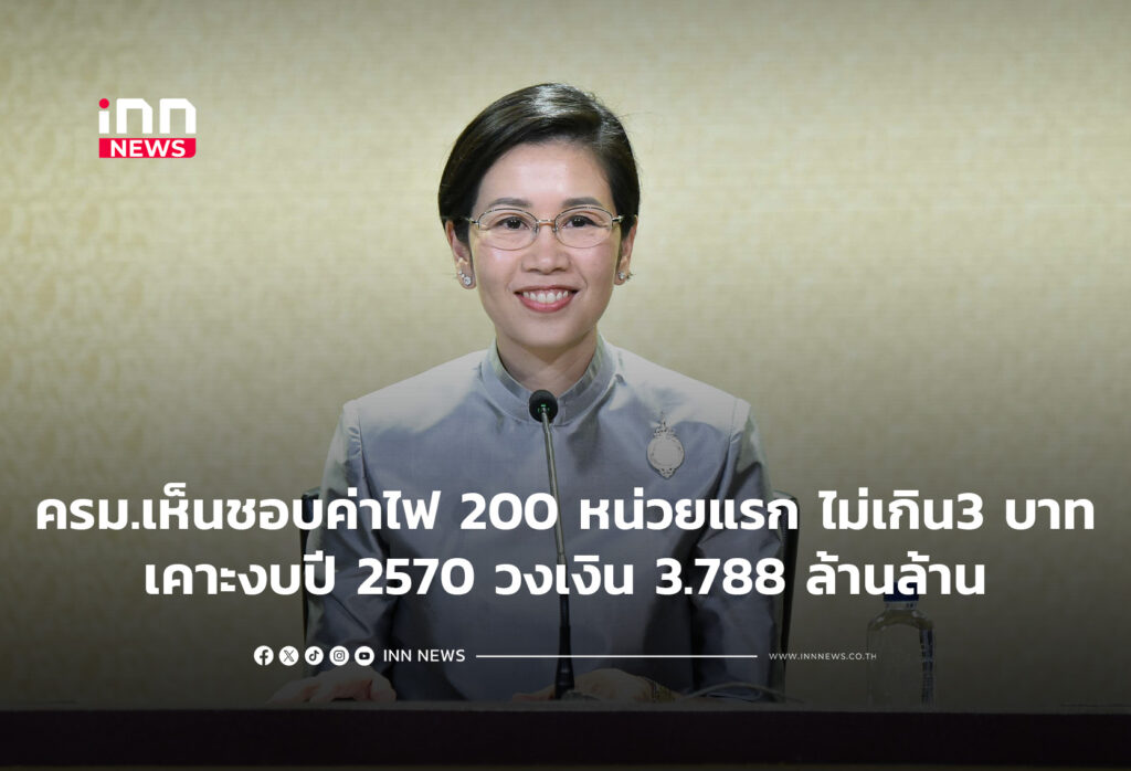 ครม.มีมติเห็นชอบค่าไฟ 200 หน่วยแรก ไม่เกิน3 บาท เริ่มรอบบิล มิถุนายนนี้ - เคาะงบปี 2570 วงเงิน 3.788 ล้านล้านบาท เพิ่มเล็กน้อย 0.2% เน้นใช้งบ “ตรงเป้า คุ้มค่า” ลดขาดดุล