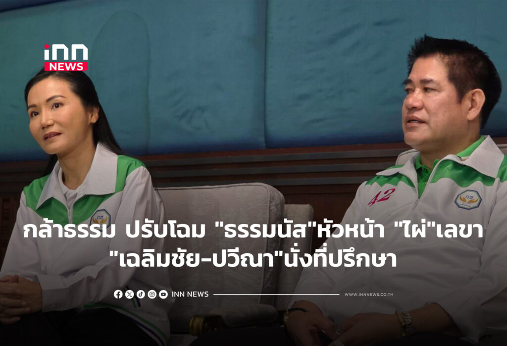 กล้าธรรม ปรับโฉม "ธรรมนัส" นั่งหัวหน้า "ไผ่ ลิกค์" เลขาฯ "นฤมล" เหรัญญิก ดัน สส.ใหม่นั่ง กก.บห."เฉลิมชัย-ปวีณา" นั่งที่ปรึกษา
