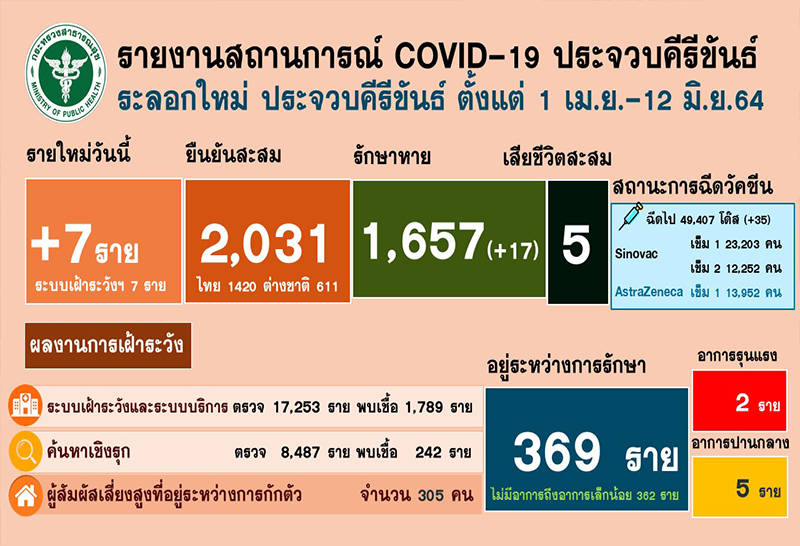 ครูสาววัย 30 ปี ติดเชื้อโควิดจากสามีดับรายที่ 5 ของประจวบฯ ขณะยอดป่วยสะสม 2,031 คน