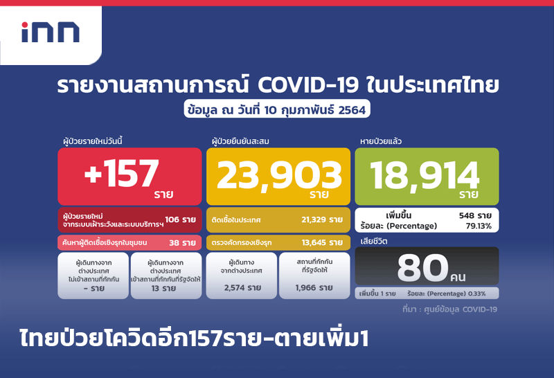 ตายอีก1!ไทยป่วยโควิดเพิ่ม157สะสม23,903