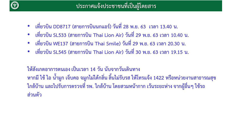 สธ.ขอผู้โดยสาร4เที่ยวบินสังเกตตัวเอง14วัน