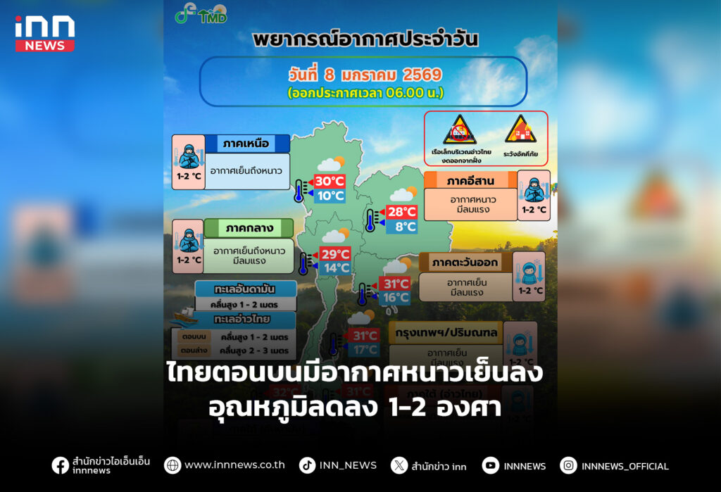 ไทยตอนบนมีอากาศหนาวเย็นลง อุณหภูมิลดลง 1-2 องศา