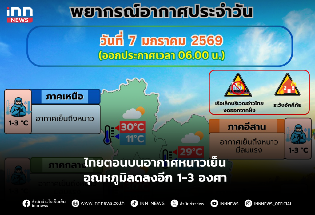 ประเทศไทยตอนบนอากาศหนาวเย็น อุณหภูมิลดลงอีก 1-3 องศาเซลเซียส ภาคใต้ตอนล่างมีฝนตกหนักบางแห่ง อ่าวไทยทะเลคลื่นสูง 2-3 เมตร
