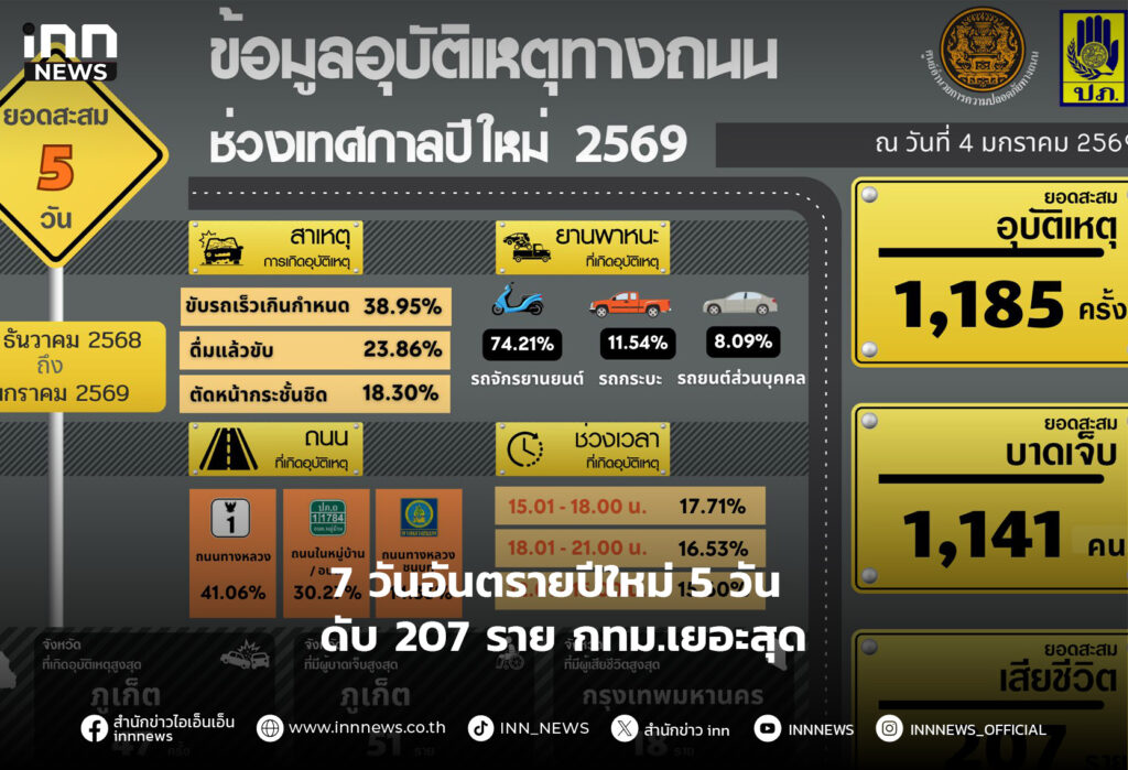 7 วันอันตรายปีใหม่ 5 วัน ดับ 207 ราย กทม.เยอะสุด บาดเจ็บ 1,141 คน เกิดอุบัติเหตุรวม 1,185 ครั้ง