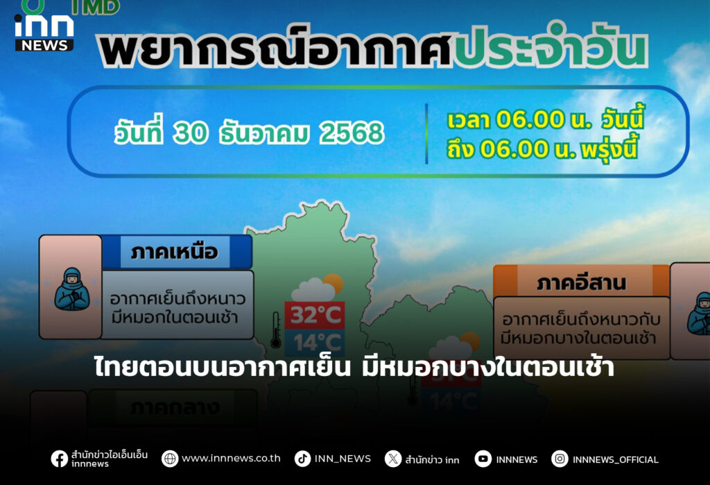 ประเทศไทยตอนบนอากาศเย็น มีหมอกบางในตอนเช้า ส่วนภาคใต้ตอนล่างฝนลดลง ทะเลคลื่นสูง 1-2 เมตร