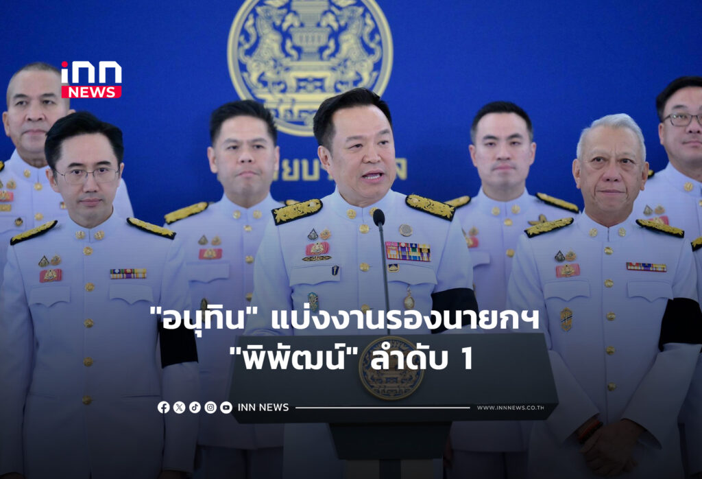 "อนุทิน" แบ่งงานรองนายกฯ "พิพัฒน์" ลำดับ 1 ดู"คมนาคม-ดีอี" ขณะ "ทรงศักดิ์" กำกับงานกีฬา-ทส.-สาธารณสุข-สปน.-สนทช." เอกนิติ"รองฯ3 ดูคลัง พลังงาน สำนักงบฯ "ยศชนัน" คุม 5 กระทรวงเพื่อไทยดูแล