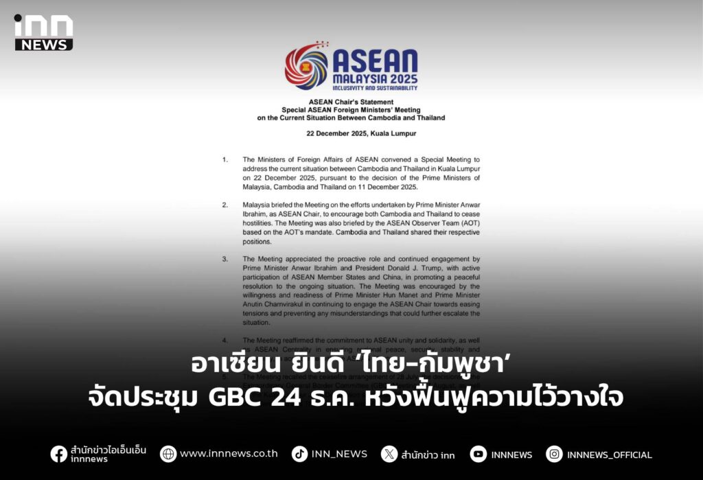 อาเซียน ยินดี ‘ไทย-กัมพูชา’ จัดประชุม GBC 24 ธ.ค. หวังฟื้นฟูความไว้วางใจ ลดความตึงเครียด