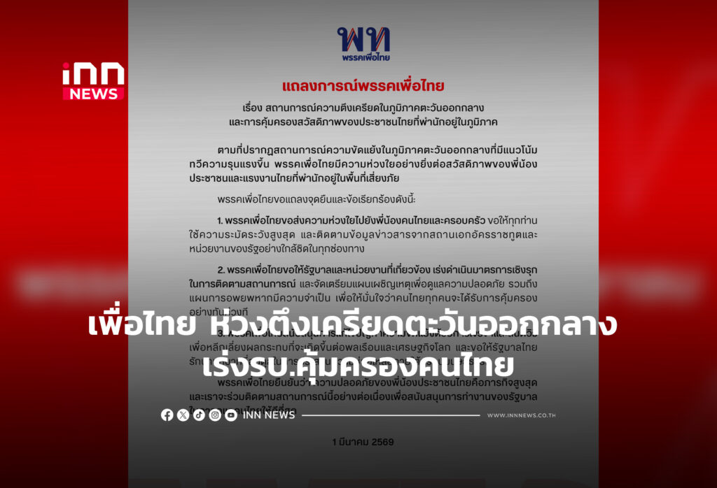 เพื่อไทย ห่วงตึงเครียดตะวันออกกลาง เรียกร้องรัฐบาลคุ้มครองคนไทยเร่งด่วน เดินเกมเชิงรุก รับมือวิกฤต หนุนเจรจาสันติภาพ พร้อมติดตามใกล้ชิด