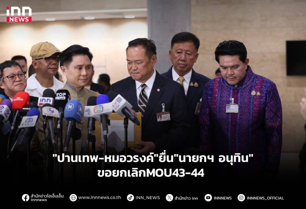 "ปานเทพ-หมอวรงค์" นำทีมยื่นหนังสือถึง "นายกฯ อนุทิน" ขอให้ยกเลิก MOU43-44 ชี้ กัมพูชาละเมิดร้ายแรง จี้ ระงับประชุม JBC-GBC-RBC ป้องกันไทยเสียสิทธิ