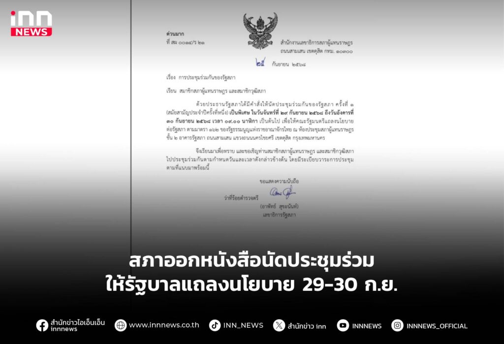 รัฐสภา ออกหนังสือนัดประชุม รัฐสภา เพื่อให้รัฐบาลได้แถลงนโยบาย วันที่ 29 และ 30 กันยายนนี้