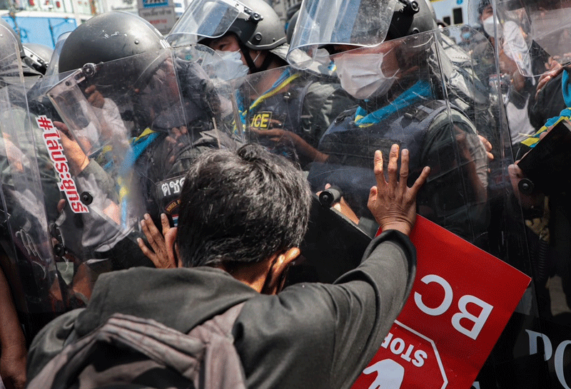ม็อบฉีกหนังสือเตรียมยื่น ผู้นำเขตเศรษฐกิจกลางแยกอโศก หลังจนท. ไม่ให้ผ่านทาง ก่อนประกาศยุติชุมนุม- มวลชนสาดน้ำใส่ ตร. สเปรย์พ่นโล่