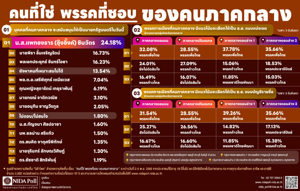 นิด้าโพล เผย คนภาคกลาง หนุน อุ๊งอิ๊ง นั่งนายกฯ ชอบอุดมการณ์เพื่อไทย "พิธา" รั้งที่สอง เลือกส.ส.พรรคเพื่อไทย