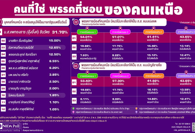 นิด้าโพล คนเหนือชู "อุ๊งอิ๊ง" นั่งนายกฯ ชี้นโยบายพรรคทำได้จริง "พิธา" รั้งที่สอง ขณะส.ส.เลือกเพื่อไทย