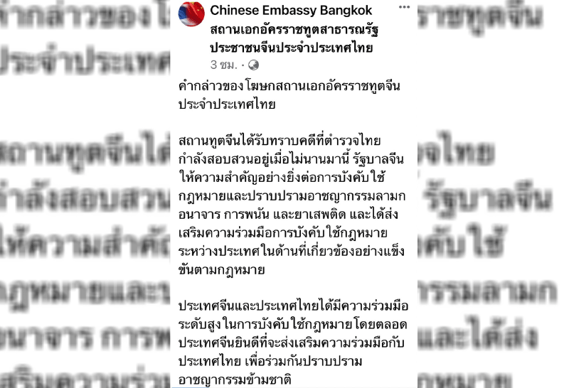 จีน ย้ำให้ความสำคัญการบังคับใช้กฎหมายระหว่างประเทศ ยินดีให้ความร่วมมือไทย ร่วมกันปราบปรามอาชญากรรมข้ามชาติ