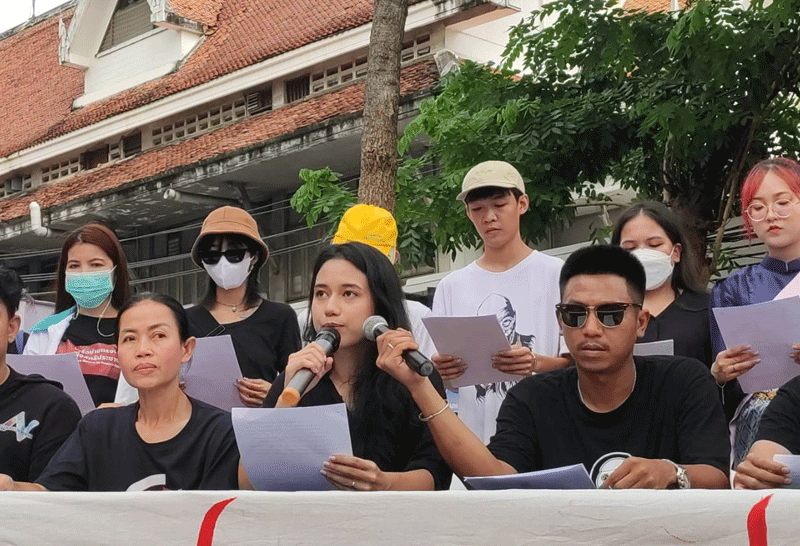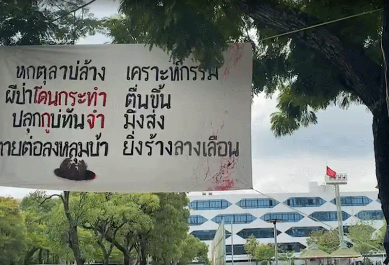 นศ.นำธงสีแดงเขียน 3 ข้อเรียกร้องปักไว้บน เสาไฟ