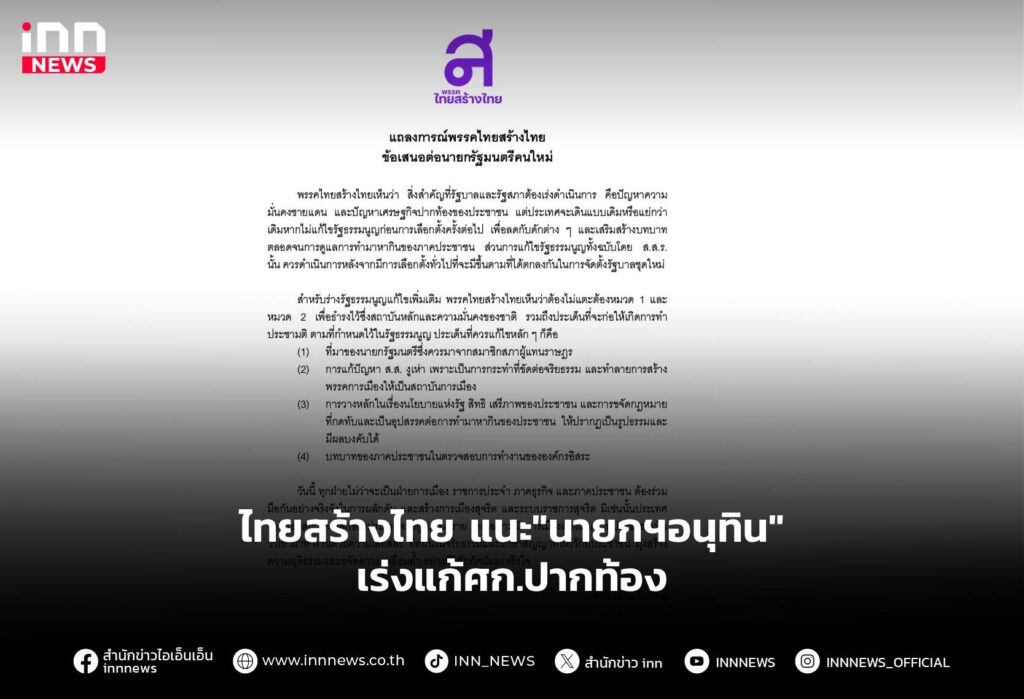 พรรคไทยสร้างไทย แนะ"นายกฯอนุทิน"เร่งแก้ปัญหาชายแดน-ศก.ปากท้อง เดินหน้าแก้ รธน.ไม่แตะต้องหมวด 1 หมวด 2