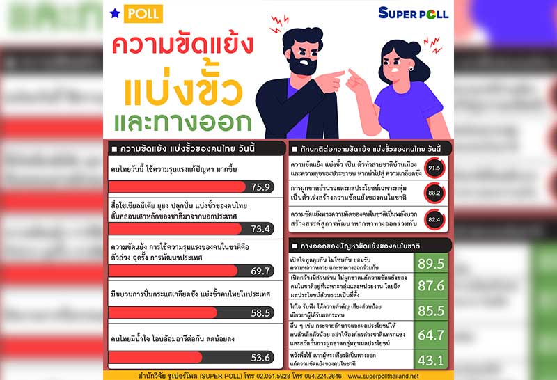 SUPERโพล มองความขัดแย้งแบ่งขั้วทำลายประเทศ ชี้ความรุนแรงคือตัวถ่วงการพัฒนา แนะปิดใจพูดคุยกันเพื่อหาทางออก