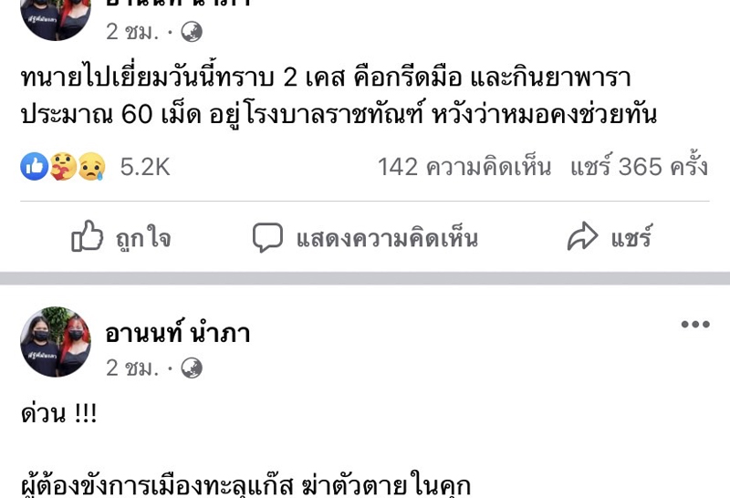 ผบ.เรือนจำพิเศษ" แจง หลัง “อานนท์” โพสต์ผู้ต้องขังทะลุแก๊สฆ่าตัวตายในคุก ระบุมี 1 รายกินยาเกินขนาด อีก 2 ราย ขูดข้อมือ เหตุจากความเครียด ยันปลอดภัยแล้ว