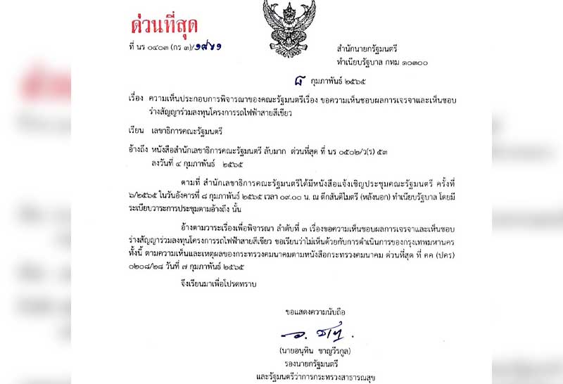 เปิดหนังสือ "อนุทิน -พิพัฒน์" ลาการประชุมครม. ค้านแปลงสัญญาสัมปทาน เป็นสัญญาร่วมลงทุนรถไฟสายสีเขียว ตามข้อเสนอของ กทม.