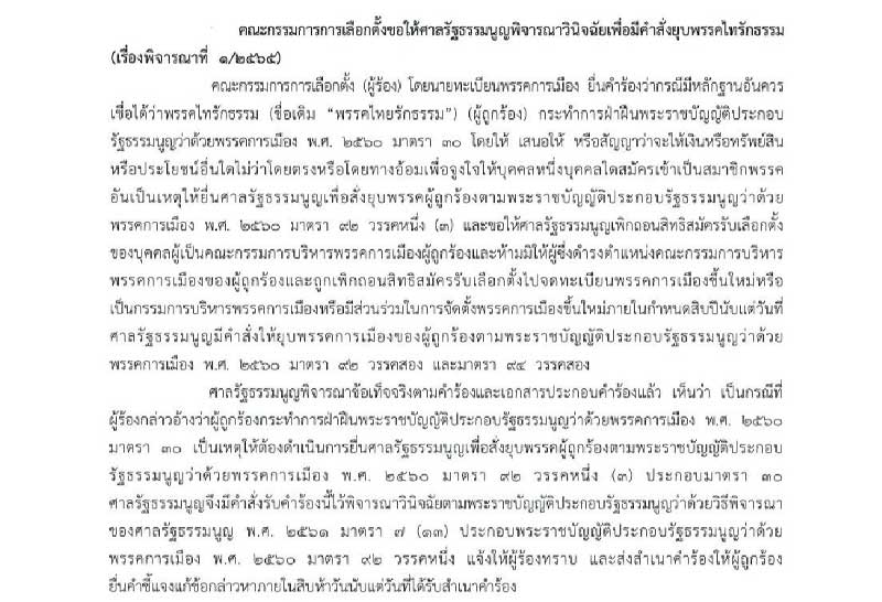 ศาลรัฐธรรมนูญ รับคำร้องกกต.ขอให้พิจารณาวินิจฉัยเพื่อมีคำสั่งยุบพรรคไทรักธรรม