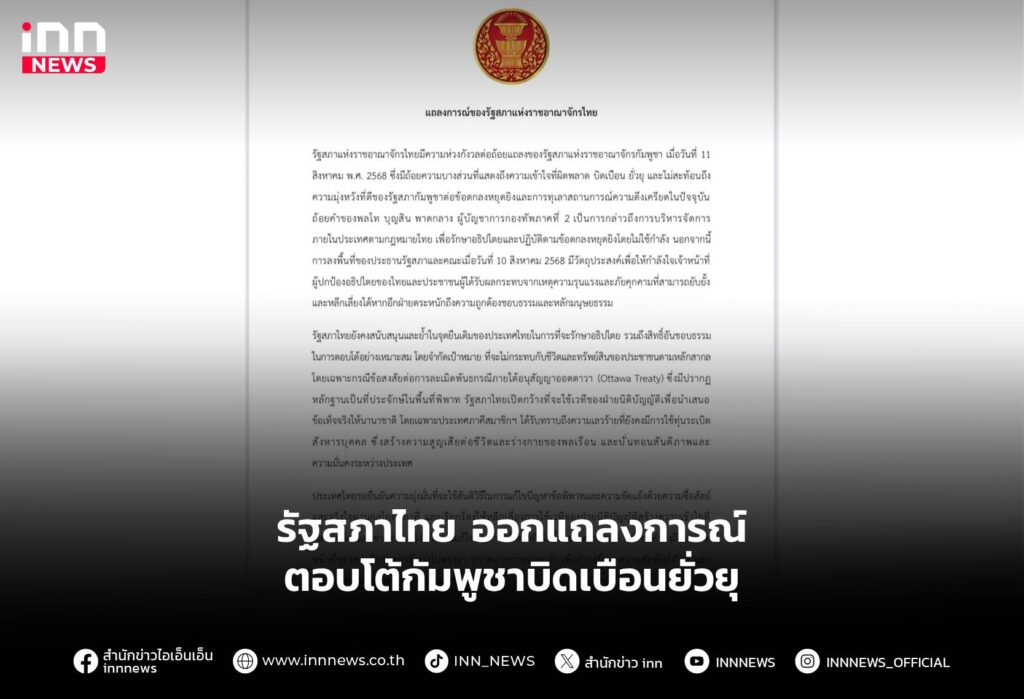 รัฐสภาไทย ออกแถลงการณ์ตอบโต้ รัฐสภากัมพูชา บิดเบือน ยั่วยุสถานการณ์ชายแดน ลั่น เตรียมนำข้อมูลการใช้ทุ่นระเบิดสังหารบุคคลสู่เวทีโลก
