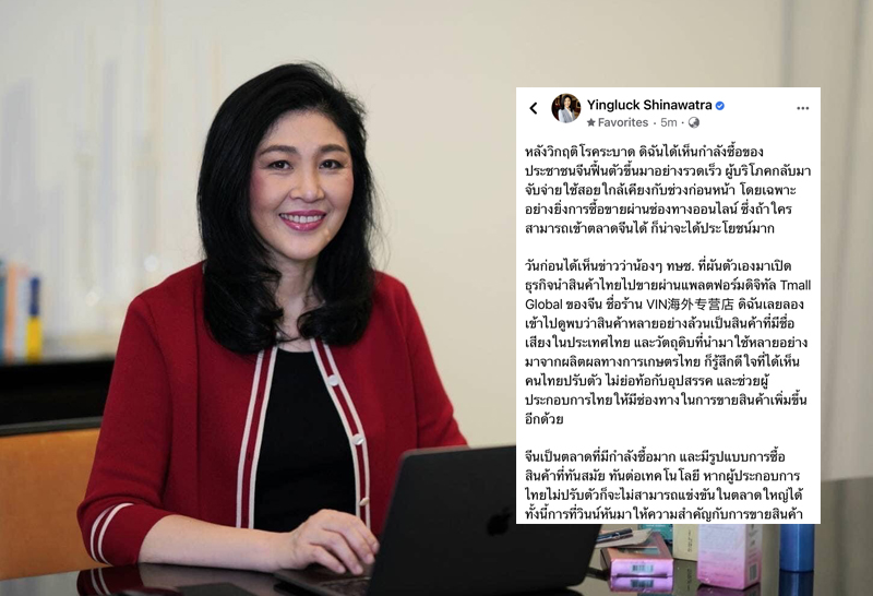 "ยิ่งลักษณ์" โพสต์หวังสินค้าไทยใช้แพลตฟอร์มดิจิทัลเติบโตตลาดโลก พร้อมยก เด็ก ทษช. ผันตัวทำธุรกิจในจีนรุ่ง