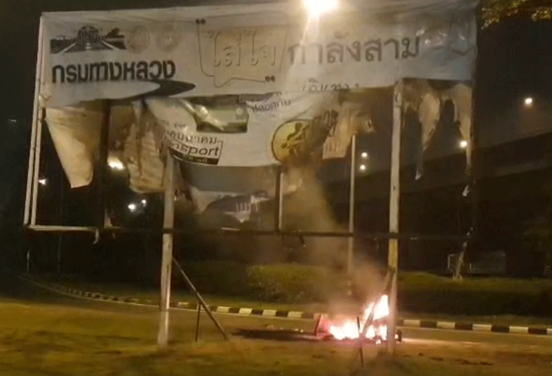 ผู้ชุมนุมจุดไฟเผายางรถยนต์บริเวณสามเหลี่ยมดินแดง